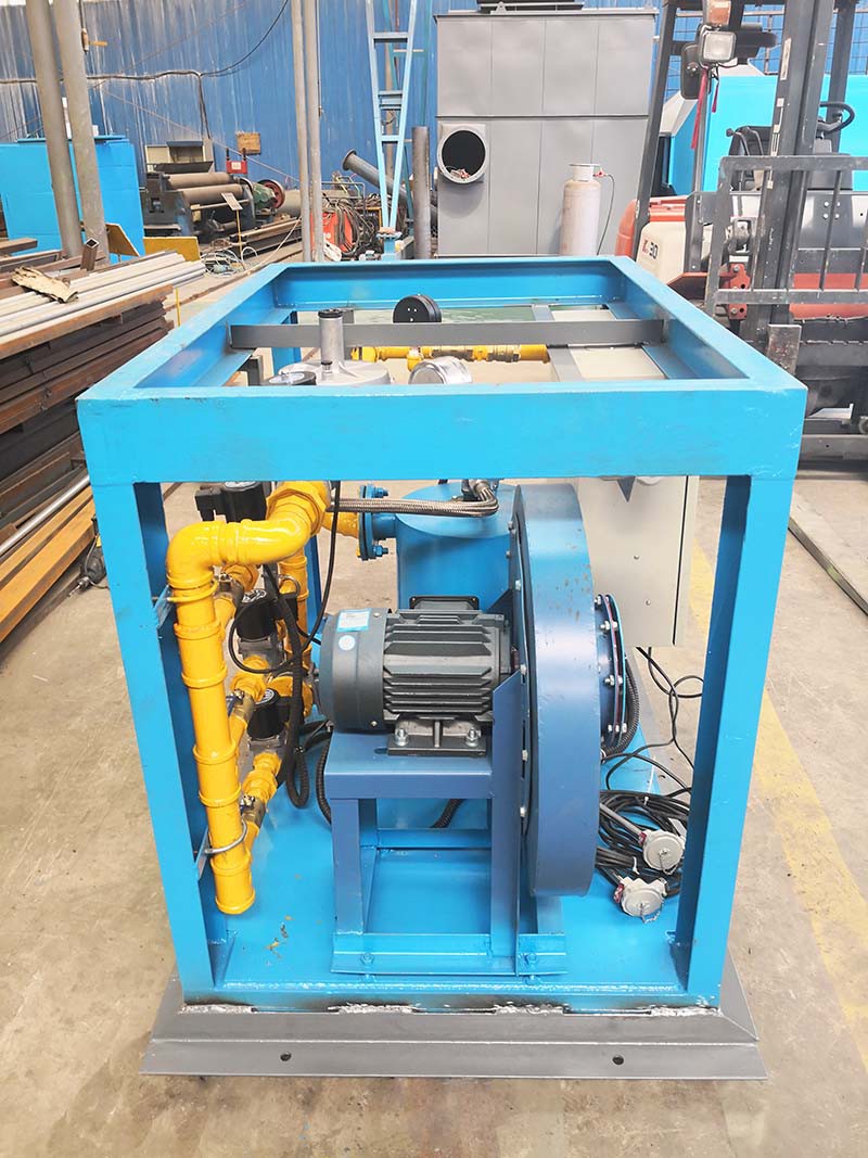 中間包烘烤器:包括燃燒器、鼓風機、助燃風管道系統和煤氣管道系統,所述助燃風管道系統一端連接鼓風機,另一端接入位于燃燒器前的煤氣管道系統,還包括通過控制煤氣管道閥門開閉自動調節溫度的控制系統,所述燃燒器為1-5個(根據膜胎尺寸確定),中間包工作層受熱均勻,易脫模節能效果明顯。